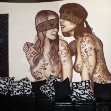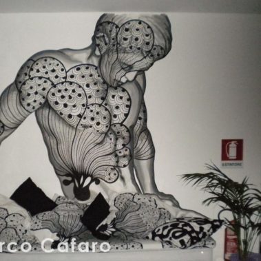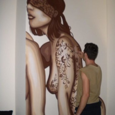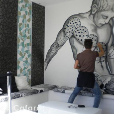Utilizzo di varie tecniche artistiche (no aerografo e bombolette) con soggetto scelto dal cliente, realizzazione in 3 ore di un area mt 2×2 su tela o direttamente su una parete del locale.